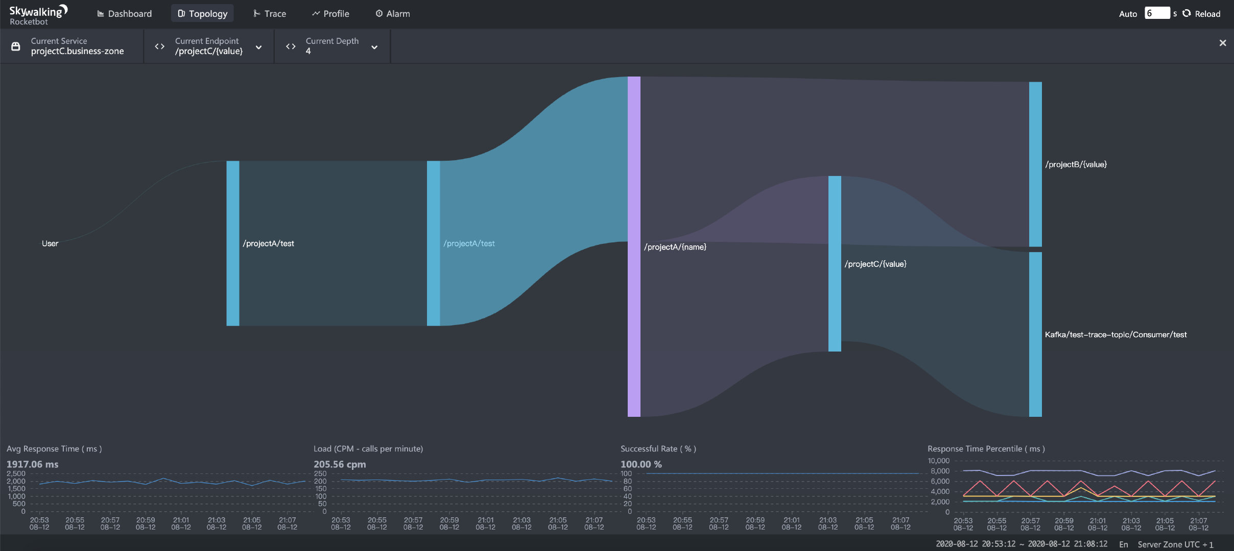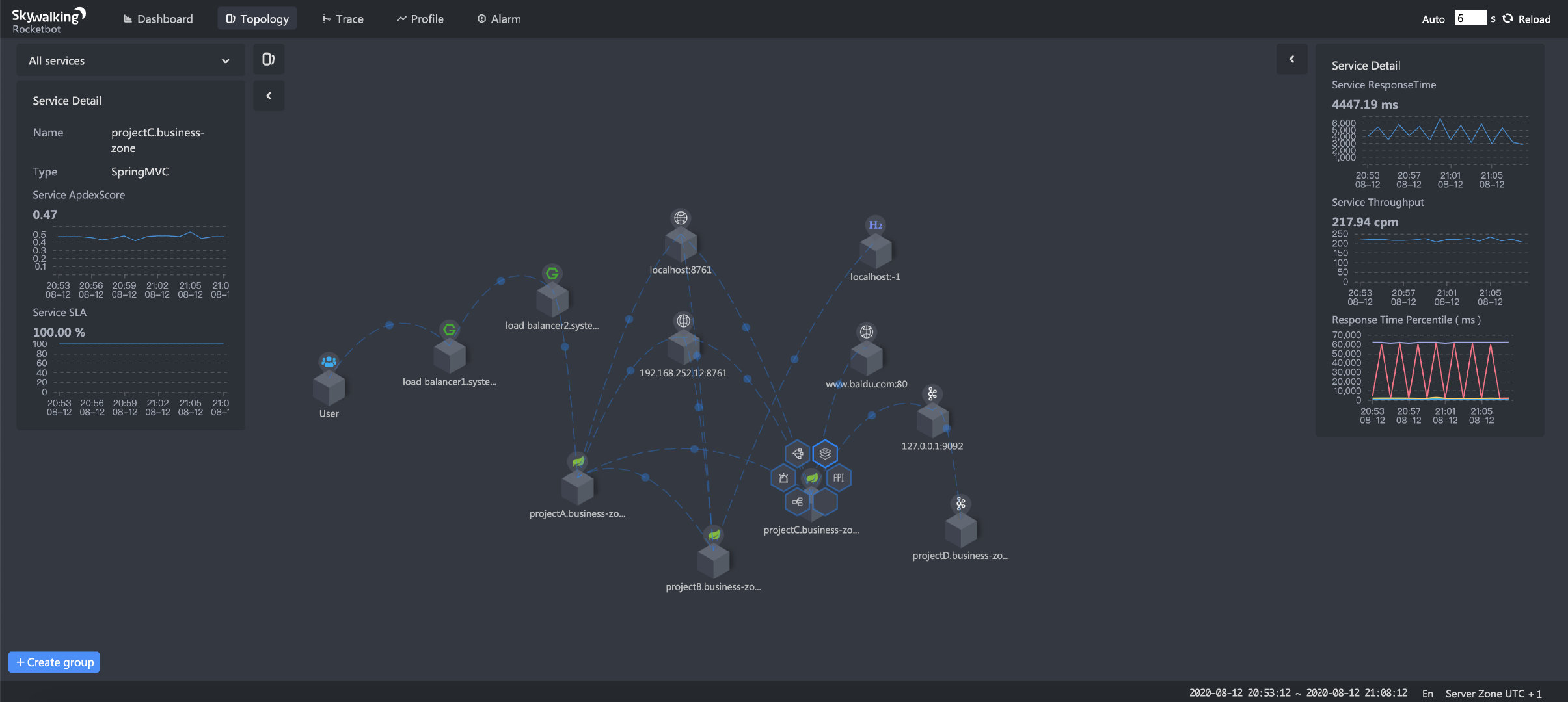 运维团队(OPS)和系统稳定性(SRE)团队通过服务拓扑图,用来观察网络情况(当做NOC dashboard使用)、确认系统数据流。SkyWalking依靠trace(跟踪数据),使用STAM(Streaming Topology Analysis Method)方法进行分析拓扑结构。在服务网格环境下,使用ALS(Envoy Access Log Service)进行拓扑分析。节点(services)和线路(service relationships)的拓扑结构和度量指标数据,无法通过sdk轻而易举的拿到。