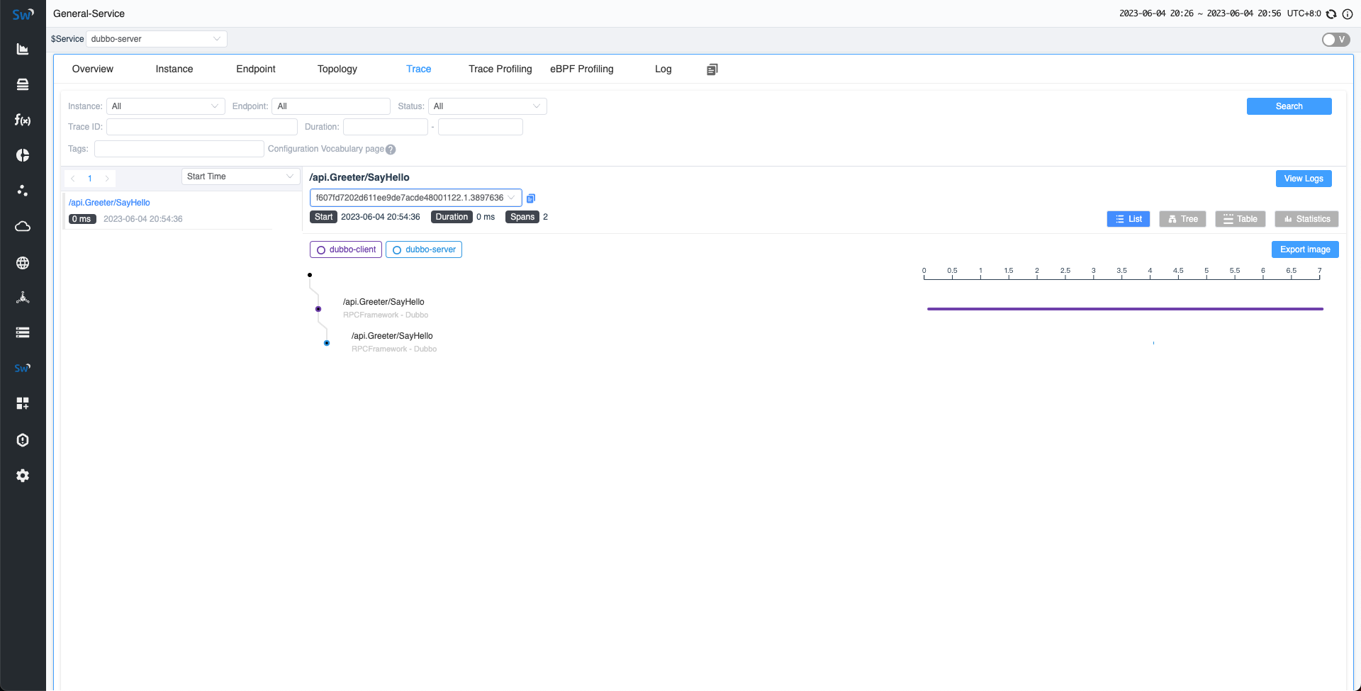 现在,由于客户端会自动像服务器端发送请求,现在就可以在 SkyWalking UI 中观察结果。